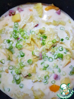 Добавить сырок, сливки и зелёный лук. Довести почти до кипения. Досолить, если требуется. Выключить плиту, дать настояться некоторое время.