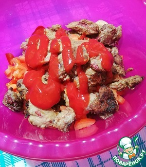 Нежная куриная печень с томатами, кетчупом ТМ "Махеевъ"и сыром Чеддер отлично подойдут для теплого семейного ужина, а зеленый лук придаст этому блюду свежесть и изюминку.