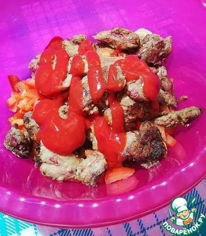 • В миску складываем печень, томаты и кетчуп ТМ "Махеевъ" Краснодарский, перемешиваем и выкладываем в форму.