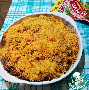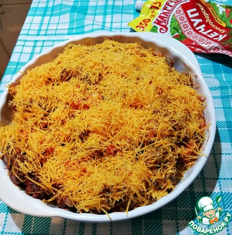 • Сверху рассыпаем натертый сыр и ставим в духовку на 15-20 минут при 200 градусах.