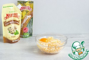 И наш последний слой. Сыр натертый на мелкой терке и последнее яйцо. Тоже тщательно перемешайте.