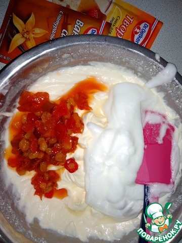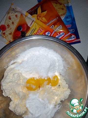 Желтки взбить с творогом, смесью Творопыш, остальной сахарной пудрой, молоком, ванильным сахаром.
