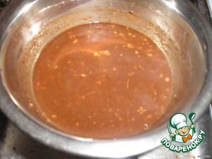 Приготовим соус. Смешиваем сок, который слили из формы, шоколад. Подогреваем на тихом огне, чтобы растворился шоколад. Добавляем коньяк. Перемешиваем.