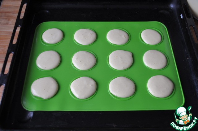 Противень застилаем пергаментом и отсаживаем кружки диаметром около 4 см на расстоянии 3 см друг от друга. Я использовала для удобства коврик для макаронс. Ставим в нагретую до 180 градусов духовку и выпекаем 10-12 минут до золотистости.