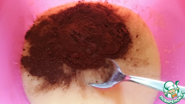 Добавляем в массу какао и муку хорошо перемешиваем.