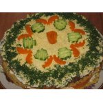 Натираем на мелкой тёрке охлаждённые плавленые сырки. Добавляем сливки, перемешиваем, ставим на огонь и ждём, когда сыр соединится со сливками (интенсивно перемешивая). Горячим кремом смазываем коржи, формируем торт и смазываем его кремом сбоку. Сверху посыпаем рубленной зеленью. Приготовленный торт оставляем остывать.