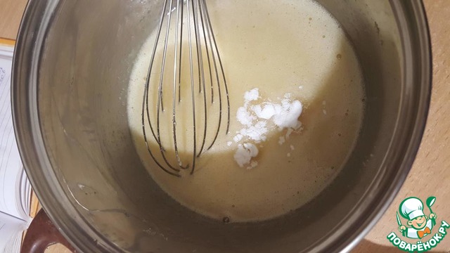 Добавить соду, перелить в другую миску, чтобы быстрее остыло, остудить до комнатной температуры.