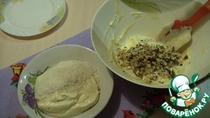 Тесто хорошо перемешиваем, можно миксером, до однородности. Делим пополам. В одну часть добавляем порубленные грецкие орехи, а в другую - кокосовую стружку. Хорошо перемешиваем оба теста.