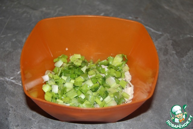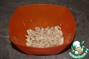 Вареные окорочка ( два маленьких, или один большой) освободить от кожи, костей, жира и тд. Нарезать мясо мелкими кубиками.