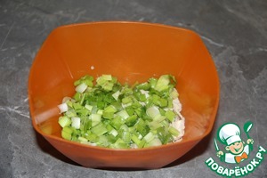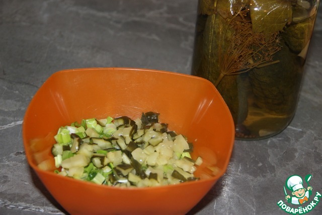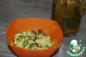 Мелкими кубиками нарезать маринованные огурцы (не крупные). Отправить в компанию к курице и луку.