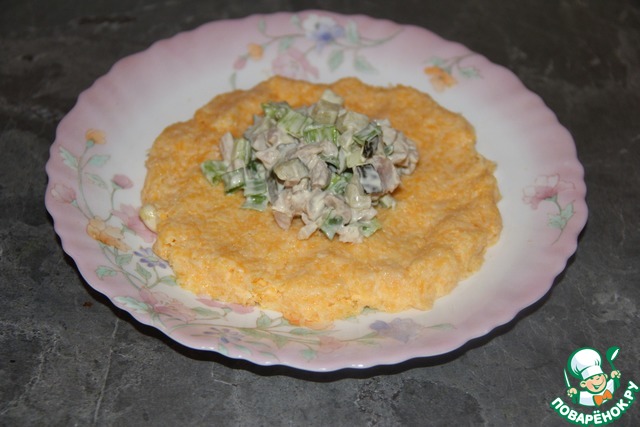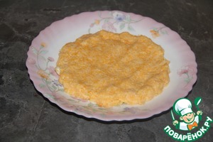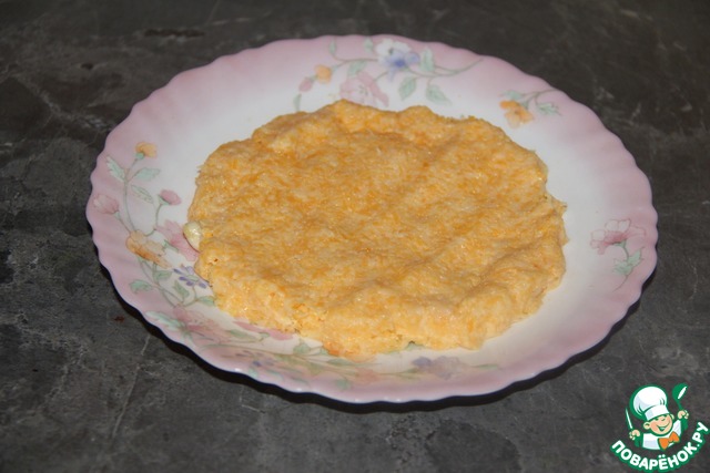 Сыр с чесноком и майонезом разделить на 6 частей. Взять одну часть и размять руками в лепешку.
