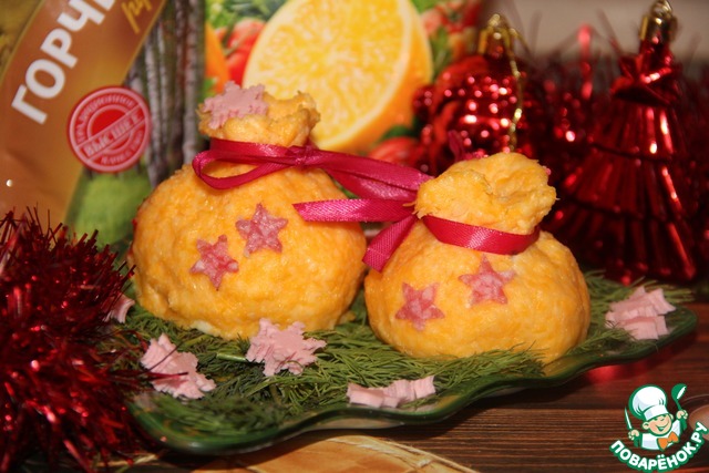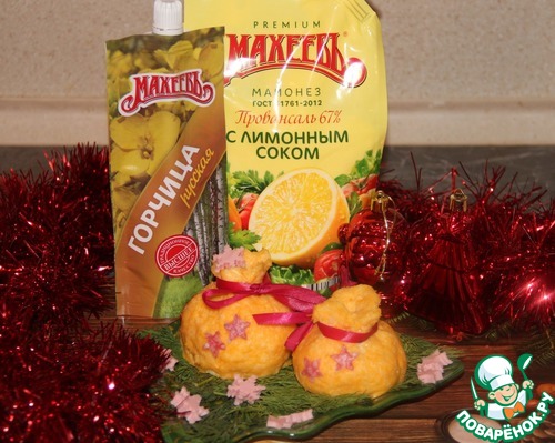 Продолжаем готовиться к Новому году и создавать предпраздничное настроение! Что такое новый год? Елка, Дед Мороз... а еще, конечно, подарки!!! Оригинальная закуска в виде мешочков с подарками точно не затеряется на любом праздничном столе! А майонез с лимонным соком и горчица русская от Мехеев сделает закуску еще и вкусной!