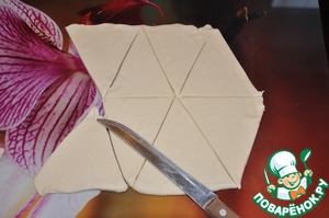 Если слоеное тесто заморожено, разморозьте его заранее. Разверните рулон слоеного теста и вырежьте из него треугольники.