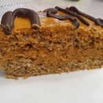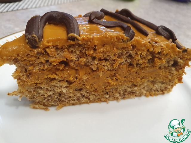Размягченное сливочное масло взбейте с вареным сгущенным молоком. Когда бисквит остынет разрежьте его на три коржа и смажьте кремом. Присыпьте оставшимися орехами. Торт сразу можно кушать, он мягкий и нежный.