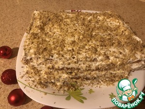 Разрезаем корж на 4 равные части. Смазываем каждый корж и бока кремом и посыпаем измельченными орешками!