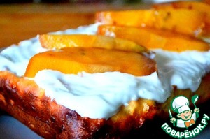Покрываем слегка остывший пирог густым натуральным йогуртом и кладем сверху спелую хурму, нарезанную ломтиками.