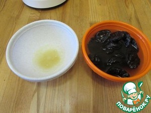 Пока бисквит остывает, приготовим начинку. Чернослив залить кипятком, оставить для запаривания. Желатин развести водой, дать набухнуть.