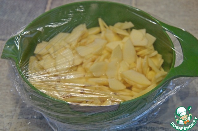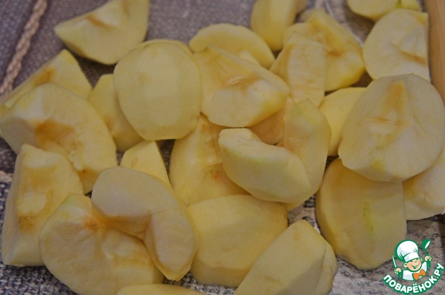 Яблоки очистить от кожицы, сердцевины и нарезать сначала на четвертинки, затем на тонкие пластинки.