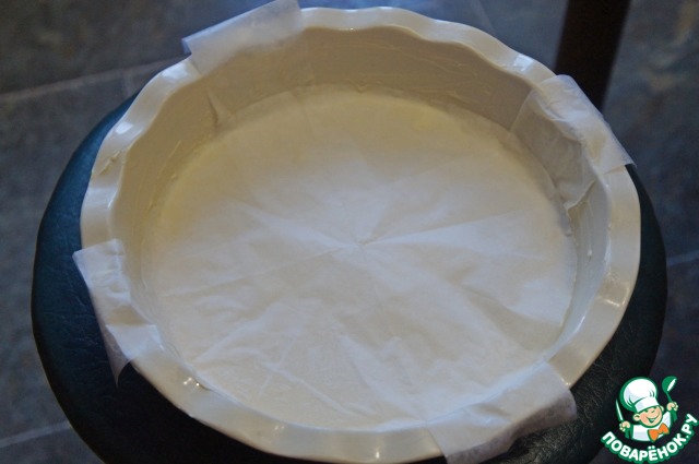 Круглую форму для пирога d 25 см тонко смазать маслом и выстелить пекарской бумагой, которую тоже очень тонко смазать маслом.