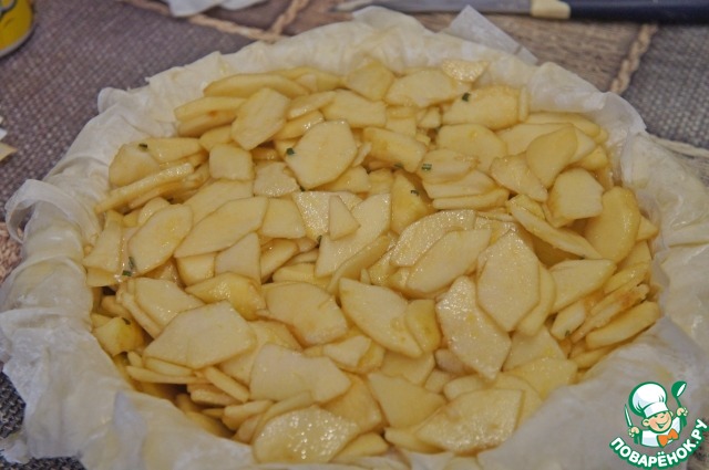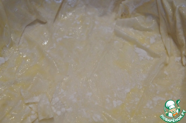 Далее процедура стандартная. Смазать лист теста фило маслом и положить в форму, края могут свисать. Посыпать лист теста сахаром, около 1/2 ч. л. Смазать маслом второй лист теста и положить его в форму немного, сместив по отношению к первому. Повторить процесс, пока в форме не будет 6 листов теста. -
