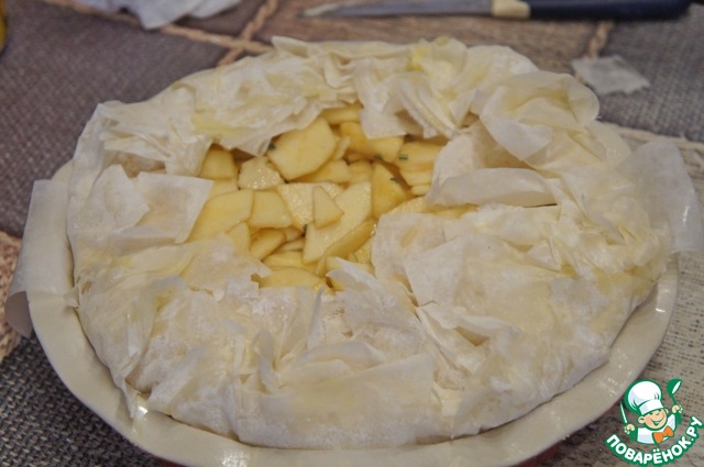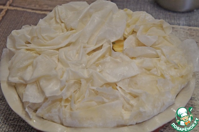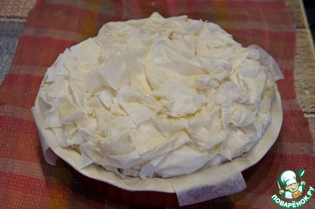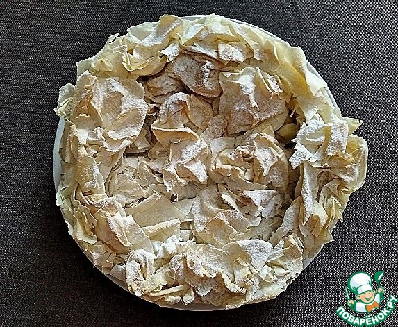 Оставшиеся листы теста «задрапировать», как сжатую бумагу, и максимально рыхло расположить на поверхности пирога, формируя воздушную и легкую горку.
