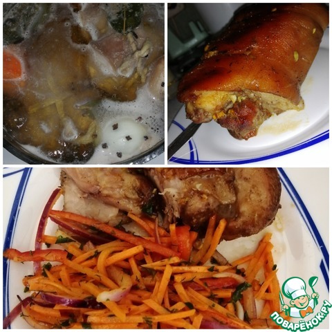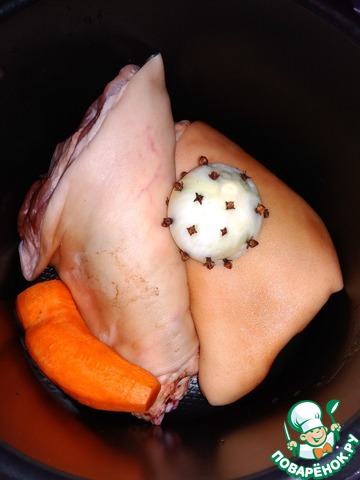 Поместить Рульку в кастрюлю, лучше, чтобы она занимала как можно больше дно. Туда отправить луковицу с гвоздикой, очищенную целую морковь, перец горошком, лавровый лист и соль. -