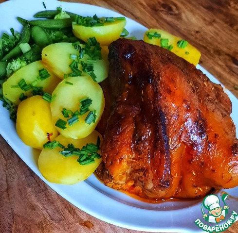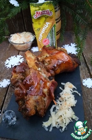 Соединить мед, горчицу, мелконарезанный чеснок, перец и соль. Намазать этой смесью рульку.