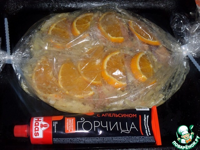 Затем утиные грудки выкладываем в пакет для запекания. Добавляем луково-горчичную массу. Поверх утиных грудок выкладываем половину оставшегося нарезанного апельсина. Укладываем пакет на противень и помещаем в разогретую духовку.