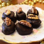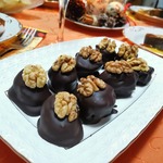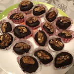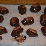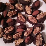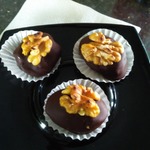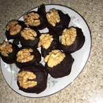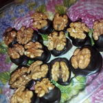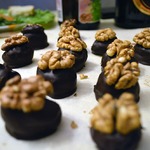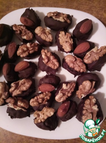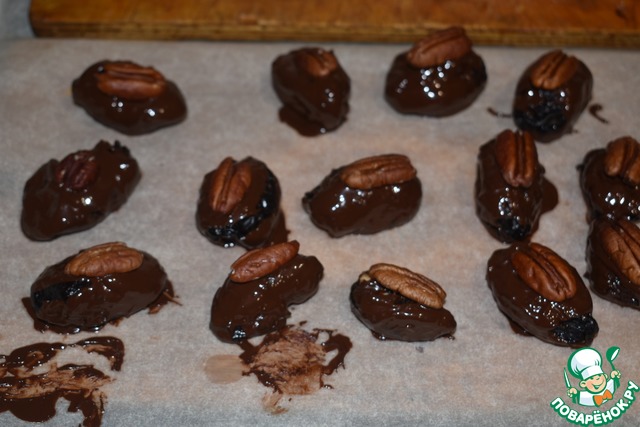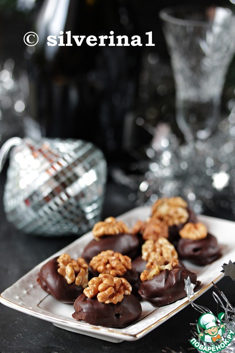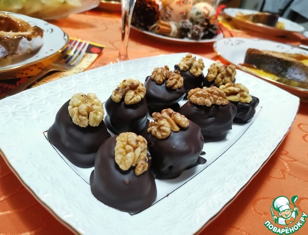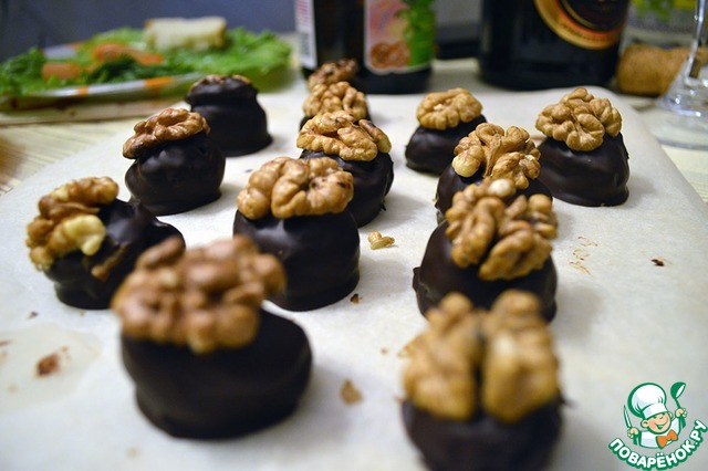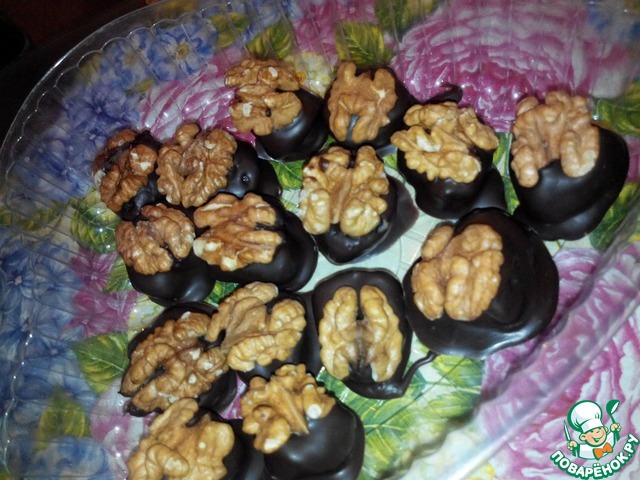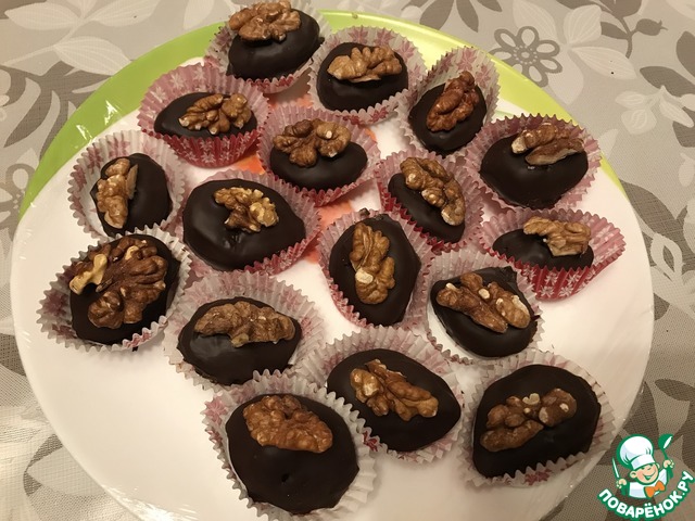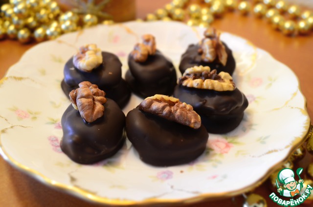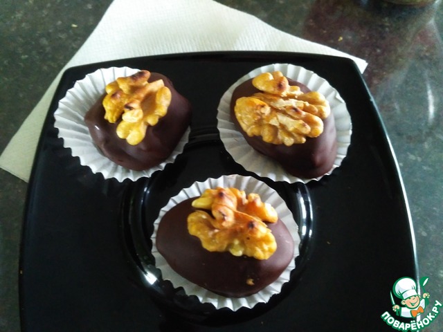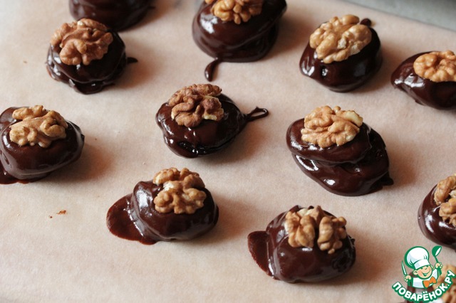 Выложить конфеты на лист пергамента, на каждую сверху положить по половинке грецкого ореха. Оставить конфеты в прохладном месте до застывания.