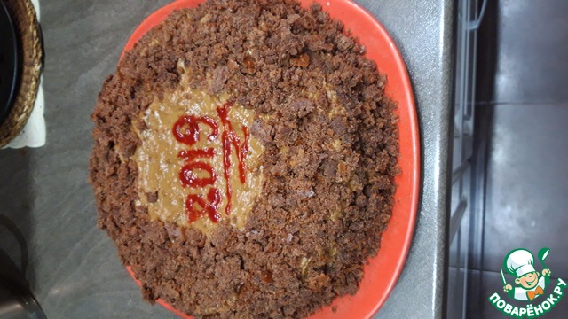 Для крема растереть желтки с 1 ст. л. сахара и мукой. Вареную сгущенку смешать с горячей водой, пол стакана смеси оставить для пропитки коржей. Остальную горячую смесь влить в желтки и на маленьком огне варить до загустения. Коржи пропитать пропиткой, и смазать готовым кремом. Украсить остатками сухого коржа.