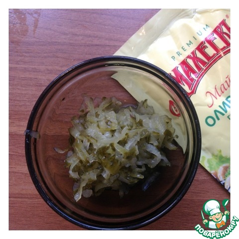 Маринованный огурец натереть на крупной терке и отжать лишний сок.
