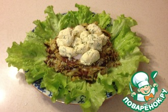7. Лопаткой подравнять края, придать салату округлую форму, украсить горошком и свежим укропом.