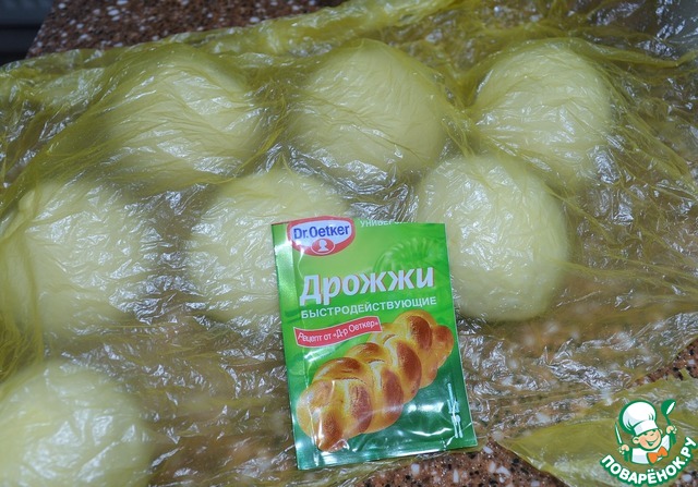 Тесто разделить на 6 частей по 100 г. и 1 -115 г., подкатать в колобки,