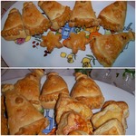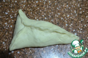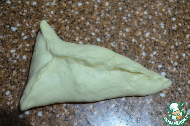 Выложить 2,5 ст. л. начинки, защепить, формуя такой треугольник.