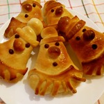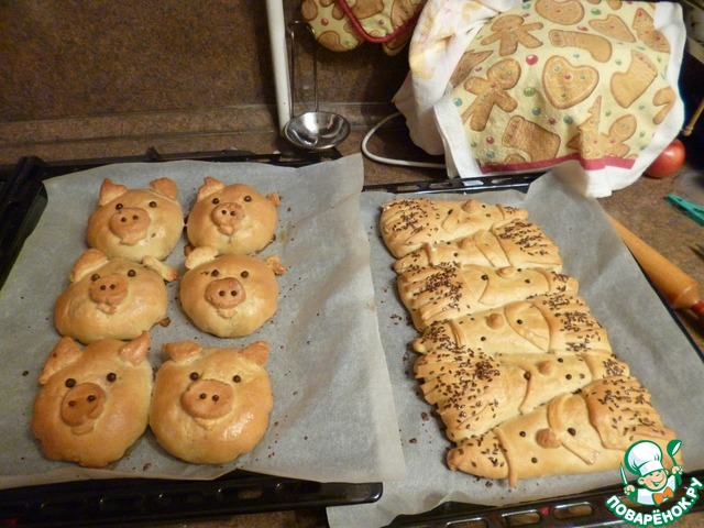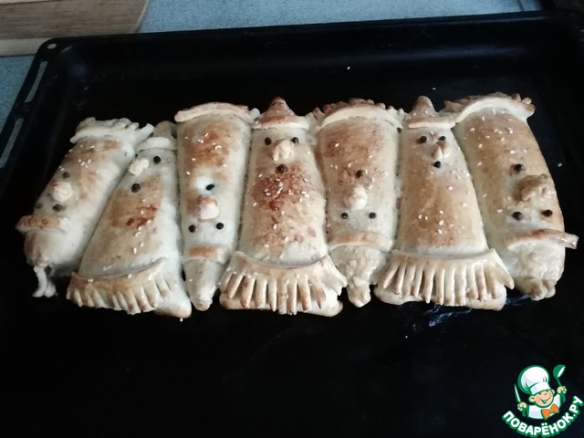 Перед посадкой в духовку, заготовки смазать сливками, кунжутом обозначить "бороду" и "шапку".