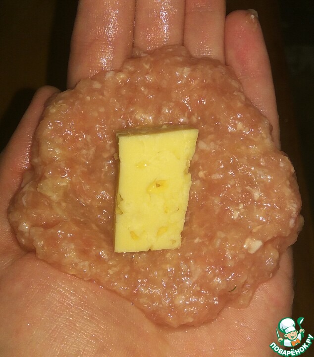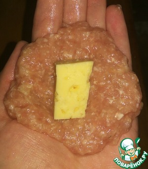 Влажными руками сделать лепёшку из фарша. Во внутрь положить кусочек сыра. Укутать сыр фаршем, формируя колобок.