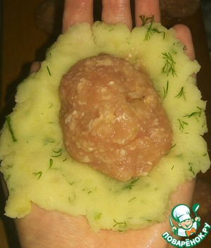На ладонь выложить 1 ст л с горкой пюре, разравнять. В середину положить мясной колобок с сыром, хорошо скрепить края пюре, формируя зразы.