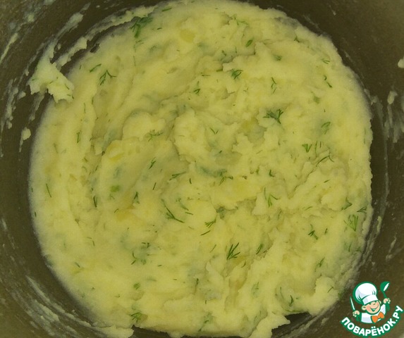 Отварить картофель. Добавить сливочное масло и молоко, сделать пюре. Посолить, поперчить по вкусу. Добавить белок одного яйца и мелко нарезанный укроп, перемешать.