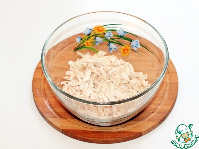 1. Мелко порежьте вареное куриное филе и выложите в большую миску.