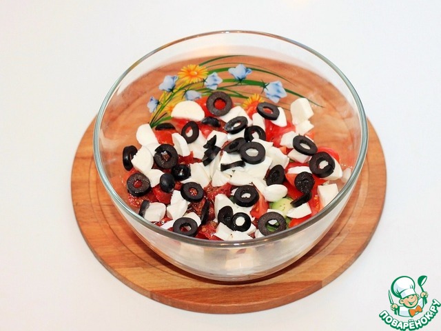 4. Сыр моцареллу нарежьте произвольными кусочками, маслины порежьте колечками.
