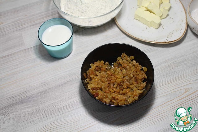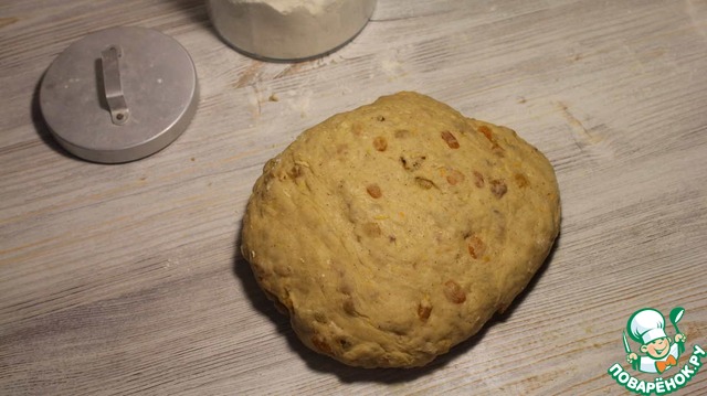 Добавляем в тесто, туда же добавляем изюм, слив перед этим жидкость. Вымешиваем