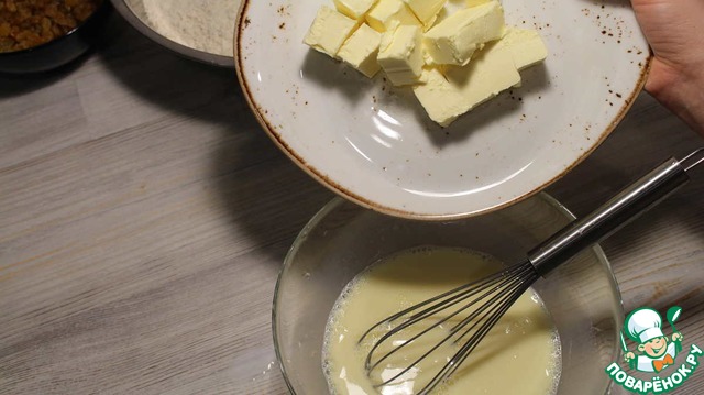 В отдельной миске смешиваем 2 яйца, теплое молоко и сливочное масло комнатной температуры