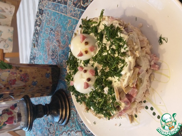 7. По желанию делаем поросят. Вареные яйца разрезаем пополам. Из ветчины делаем ушки, хвостик и пятачок, из черного перца горошком-глазки. Выкладываем сверху на салат.
