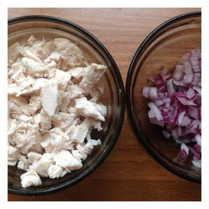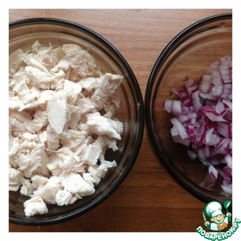 Куриное филе нарезать маленьким кубиком, как и лук.