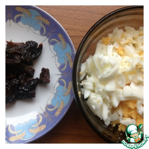 Яйца нарезать небольшим кубиком, как и чернослив. Предварительно его замачивать не надо.