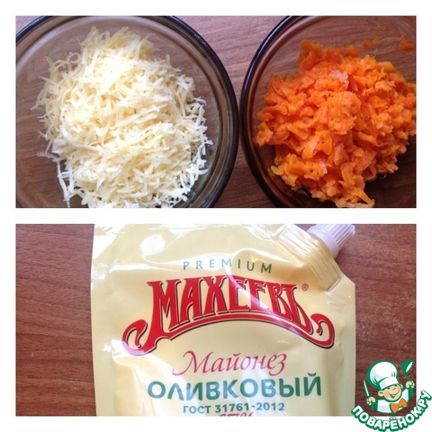 Морковь натереть на крупной терке, сыр на мелкой. Собрать салат слоями.
