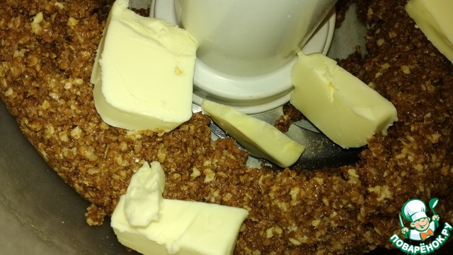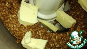 • Сливочное масло достать заранее, чтобы было мягкое. Режем на небольшие кусочки и отправляем в нашу массу. Перемешиваем.
