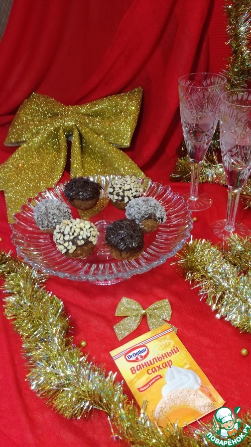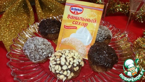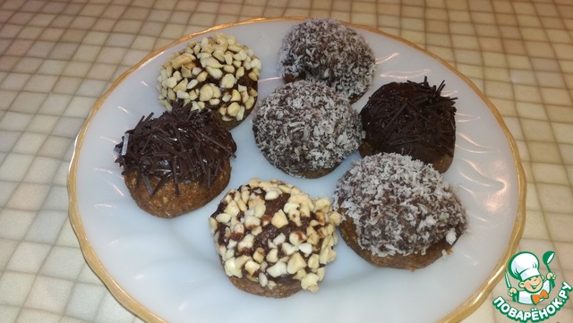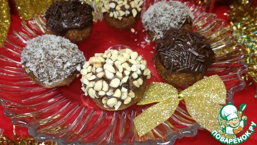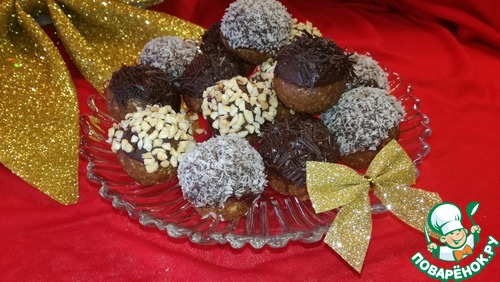 • Шоколад растопить на водяной бане. Каждый шарик на половину обмакнуть в шоколад.