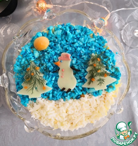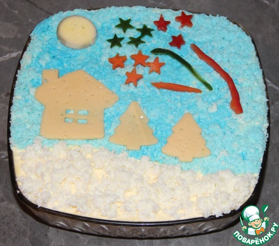 Теперь украшаем. Нижнюю часть салата выкладываем неокрашенным белком, символизирую снег. Верхнюю голубым - это ночное небо. Оставленный кусочек желтка - луна. Из сыра вырезала домик и елочки. Они белые, тк ведь они в снегу и под лунным светом все такое загадочное...))) Салют вырезала из красного сладкого перца, вареной моркови и огурца.