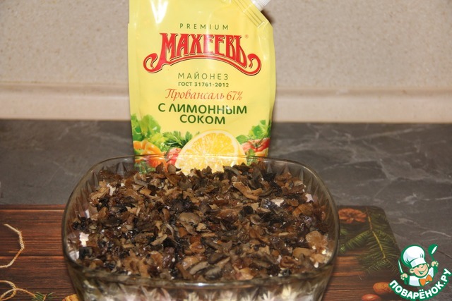Грибы нарезать кубиками, выложить на мясо. У меня грибы лесные, замороженные. Ассорти. Я их обжарила не размораживая, а затем нарезала кубиками. Если у Вас не заготовлены лесные грибы, Вы можете обжарить шампиньоны. Но, мне кажется, с лесными вкуснее и ароматнее. Грибы смазать майонезом.